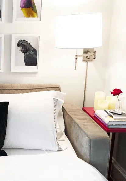 Proper lighting can be a game changer. One of the best decisions we made for this room was to mount the lamps on the wall. Obviously, it was a huge space saver and it’s a great addition to an overhead light. There’s nothing worse than getting settled in bed and realizing that you have to get up to turn off the light. These lamps are close enough to turn on or off without getting up and it’s also a benefit that two people can use them independently.