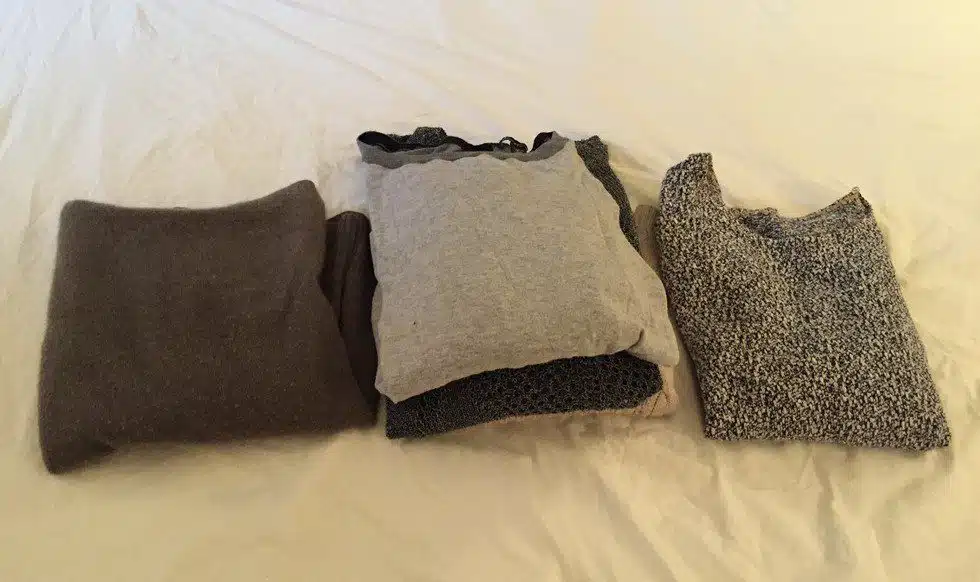 Kate and Ann then take out EVERYTHING in one category and put it on the bed: sweaters, t-shirts, jeans, tank tops, etc. This way you can see how many of each category you have and if there are any duplicates.