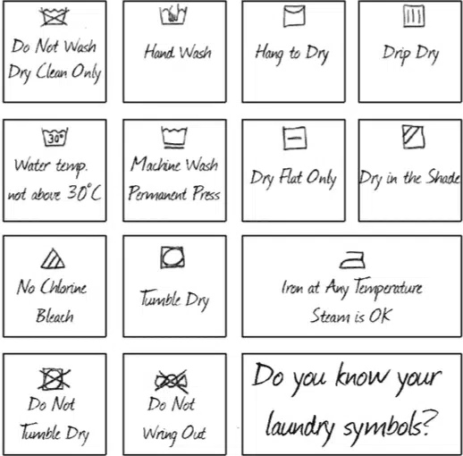 Never fear, we’ve got you covered! Below is a chart that explains what all those tiny squares mean. You can now go forth and wash (or don’t if it’s dry clean only!) with confidence.