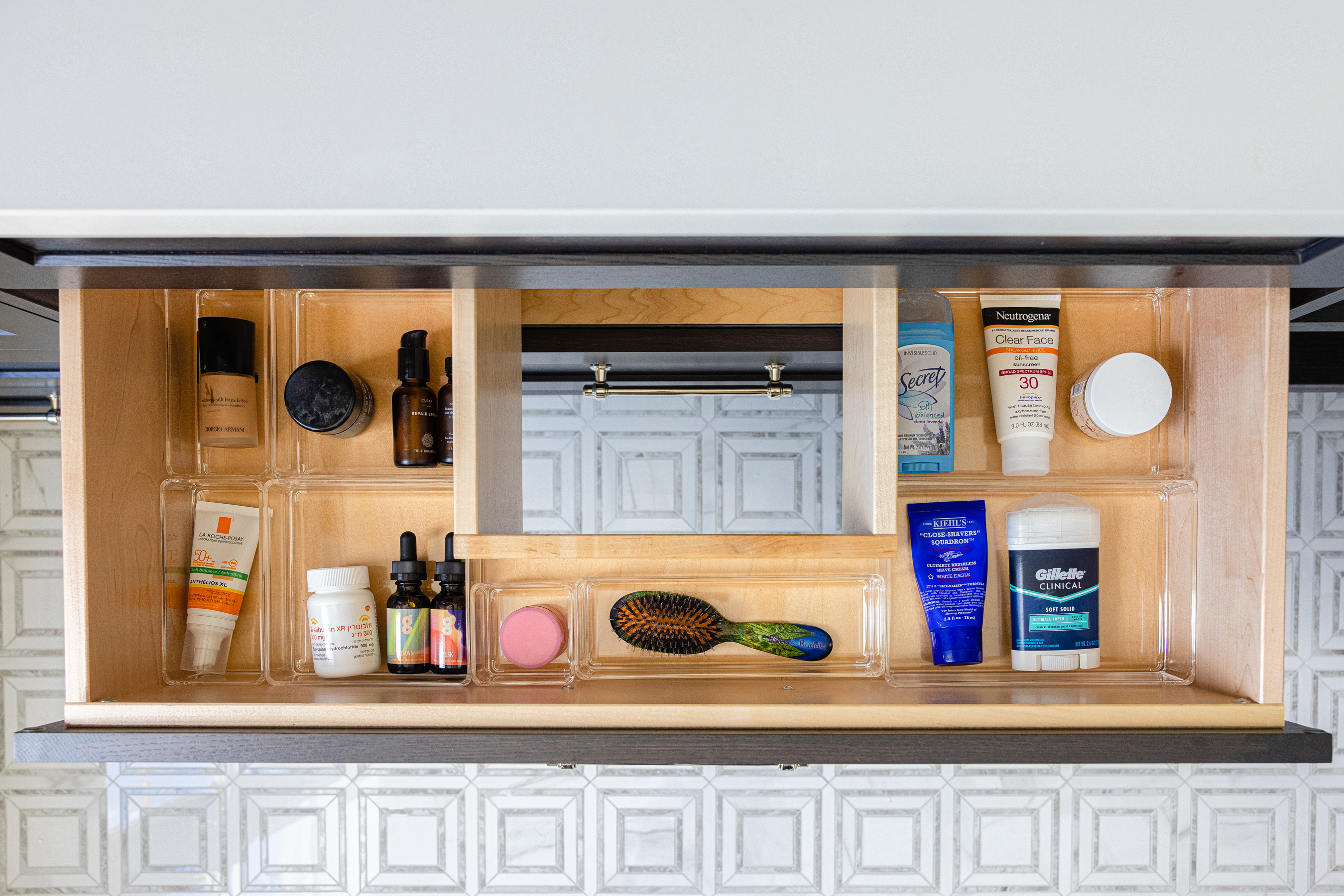 Now that you’ve pared down, it’s time to create logical categories. Grouping like items together is the foundation of any organizing system that actually sticks — your future self will thank you every morning.